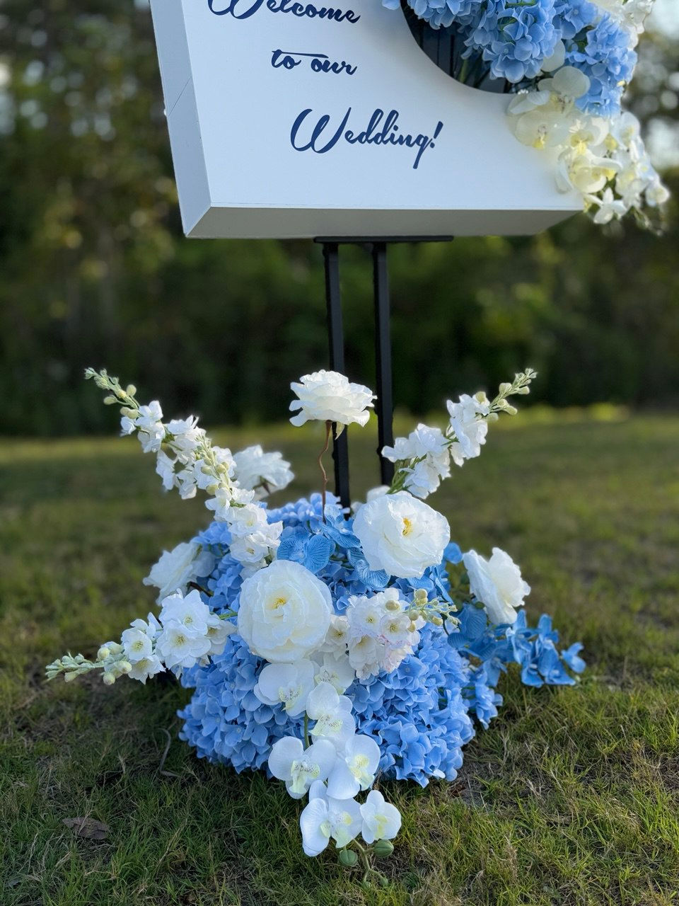 Soft Blue Blossoms is a romantic wedding decor collection featuring soft blue florals, white flowers, and greenery. This collection creates a calm, elegant, and airy atmosphere, perfect for outdoor weddings, garden venues, and classic romantic ceremonies.
